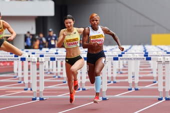 (写真:12秒54で優勝したマーシャル<右>を追う日本人トップの3位の田中佑美 ©日本陸上競技連盟)