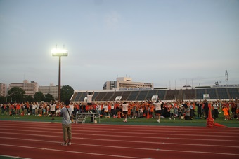 18時を回ると、“夏祭り”からフェスへ。「ORANGE DANCE TIME」と称して、選手と一緒にピッチ内に集まった観客は踊った。選手とファンが一体となって参加するイベントは、ミニチームゲームとプレゼント抽選会と続き、最後はオフィシャルカメラマンによる全員で記念撮影。退場する観客を選手、スタッフが見送り、今年の“夏祭り”は閉演となった。