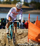 2月11日、大会当日は好天に恵まれたこともあり、朝から増え続けた観客が1周1.5kmのコース脇に鈴なりになっている。このためにオランダから帰国した元マスターズ世界チャンピオン荻島美香選手をして「まるでベルギーみたい」と言わせたくらい。レースは日本チャンピオンの竹之内悠選手が前半から積極的な展開を見せ、中盤からはベルギーのベン・ベルデン選手と、アメリカのシクロ界のレジェンド、ティム・ジョンソンが素晴らしい走りを見せる。竹之内も粘りを見せて4位と健闘、日本勢としての意地を見せてくれた。そんな熱い選手たちの走りに触発された観客も大盛り上がり。いつもは観光客で賑わうビーチがすっかりサイクルスポーツ会場となった。(写真:アメリカの英雄ティム・ジョンソンがお台場を走る!)