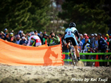 そして今回の開催で確実に日本のシクロクロス界は新しいステージに向かう。ただやるだけでなく、見てもらうことにも意識した大会運営という考え方が浸透してくるだろう。また、選手も見られる環境ができると自覚が変わってくるはずだ。手抜きは許されないし、自己満足ではファンも許さない厳しさがある。だから今回の大会は運営サイドにも、選手にも多大な影響を及ぼすだろう。皆が見られることを意識することで、競技のパフォーマンスはもちろん観客、スポンサー集めなどにも影響してくるはずだ。日本選手の将来的な活躍のためにも、日の目を浴びる大会を増やすことは重要であると思う。(写真:観客を沸かせた竹之内の走り)