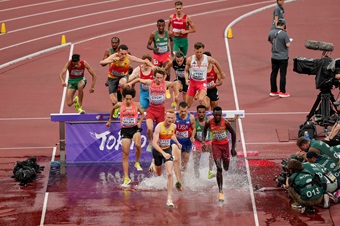 (写真:ハードルだけでなく水壕を跳び越えるのが3000m障害の特徴だ ©Ross Turteltaub for World Athletics)