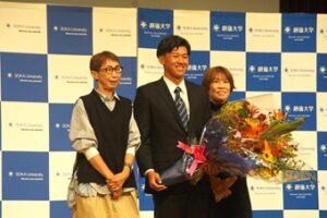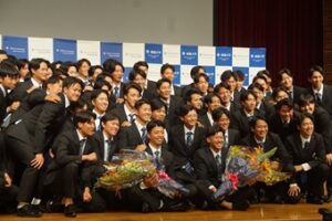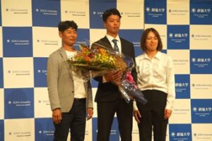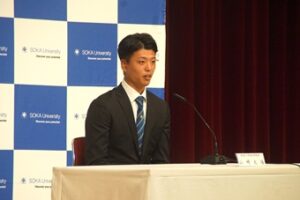 23日、NPBドラフト会議が都内で行われ、育成を含む116人がNPB球団から指名を受けた。3球団の1位指名が競合した創価大学内野手・立石正広は阪神が抽選の結果、交渉権を獲得した。創価大からは立石のほか、投手の山崎太陽が東京ヤクルトから3位指名を受けた。2人は約700人のメディア、関係者が集まった東京・創価大八王子キャンパス内の中央教育棟ディスカバリーホールで指名の喜びを語った。