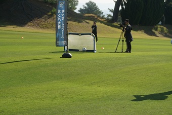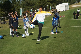 W杯出場経験のある加地さんは「Jリーグと日本代表のスーパーレジェンド、加地亮でございます。(笑)」と自己紹介し、会場の空気を和ませてからサッカーの指導にあたりました。最初は、ゴルフコース内に設置した約20m先にあるミニゴールにボールを蹴り入れる練習メニュー。「サッカーのピッチじゃないから、フックなのかスライスなのか、ラインを読みながら頑張りましょう」と小学生に声をかけました。
