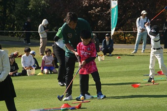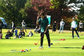 その後、加地さんは、ミニゲーム中にトコトコとコートの外へ。どこに行くのかと思ったら、すぐ隣のスナッグゴルフ教室に飛び入り参加。クラブを持って構えるとギャラリーの子どもから「加地さん、頑張って~」と黄色い声援。「ありがとうー!」と右手でガッツポーズをつくり、笑顔で応えました。