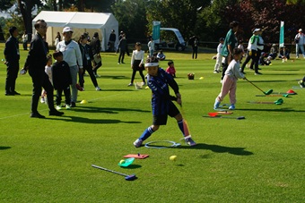 『JLPGAステップ・アップ・ツアー明治安田レディスオープンゴルフトーナメント』(試合会場:茨木国際ゴルフ倶楽部、大阪府茨木市内)の最終日となった11月8日、明治安田とJLPGA(日本女子プロゴルフ協会)は、小・中学生を対象とした「スナッグゴルフ&サッカー教室」を午前と午後の部にわけて実施しました。メディアに公開された午前の部には38名の小学生が参加しました。雲一つない青空の下、子どもたちの笑顔が輝いていました。