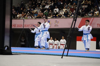 東京2025デフリンピック・空手競技初日が23日、足立区の東京武道館で行われた。日本勢は湯澤葵(フリー)、森こころ(筑波大付属聴覚特別支援学校)、金子陽音(東京都立中央ろう学校)で臨んだ女子形団体、男子個人形の森健司(立命館大学)が金メダル。女子個人形は前回組手との2冠の小倉涼(埼玉県立坂戸ろう学園教員)が銅メダルを獲得した。