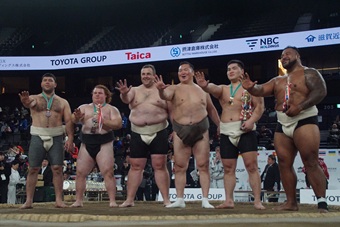 白鵬氏が掲げる世界相撲グランドスラムに向け、海外招待選手によるエキシビションマッチを行なった。エディ・ジョー・ウィリアムズ氏(オーストラリア)、バットマグナイ・エンクトゥフシン氏(モンゴル)、ヤルデン・ヤトコヴスキー氏(イスラエル)、クサノフ・クスニディン氏(ウズベキスタン)が参加。総当たりの勝者がエストニア出身の元大関・把瑠都ことカイド・ホーヴェルソン氏に挑戦した。結果はエンクトゥフシン氏に胸を貸したホーヴェルソン氏が、意地を見せて勝利。最後は出場者全員で笑顔で記念撮影に応じた。
