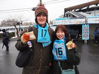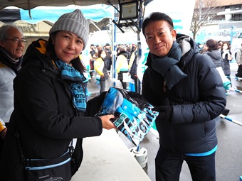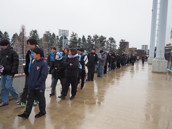 明治安田川崎支社の社員とフロンターレスタッフが協力し、11時30分からベースボールシャツの配布をスタート。開始とともに、フロンターレファンが長蛇の列をつくりました。筆者が計測すると、列は90メートルに達していました。大雪に見舞われた中、寒さに負けず列を作ったファンの表情は晴れやかでした。