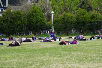 一方、スタジアムの東側に隣接している投てき練習場では「ヨガ体験イベント」が開かれました。コースは大人を対象にした「リフレッシュヨガ」と親子で参加できる「ファミリーヨガ」の2つ。講師はヨガ指導歴9年目の小野麻亜矢先生。