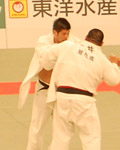 シドニー五輪男子100キロ級の金メダリスト・井上は、自分の柔道に徹した。初戦の2回戦は「有効」ポイントでの優勢勝ち、3回戦は大藤尚哉(警視庁)に一本勝ちと調子を上げて迎えた高井との準々決勝。互いに大内刈り、払い腰、大外刈り、内またと、積極的に技を仕掛ける中、残り10秒、井上は得意の内またで勝負に出るが、高井にすかされ「技あり」、そのまま抑え込まれ、合わせ技一本で敗れた。(写真:高井(手前)に敗れ準々決勝敗退に終わった井上)