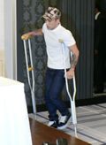 18日、「DREAM.5」(7月21日、大阪城ホール)に出場する予定だった山本“KID”徳郁(KRAZY BEE)が右膝前十字靱帯の断裂により、同大会を欠場することが発表された。都内で記者会見に応じたKIDは「すごく出場したかったので、残念で仕方がない。ファンの皆さんに謝りたいです」と無念の表情を浮かべた。(写真:会見に松葉杖姿で登場したKID)