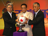 1日、日本サッカー協会(JFA)は第88回天皇杯全日本サッカー選手権大会の記者会見を行なった。9月13、14の両日に1回戦が行なわれ、47都道府県の代表と大学シードチームの48チームが対戦する。3回戦以降、順次登場するJクラブとともに、2009年元日に東京・国立競技場で開催される決勝を目指して、熱い戦いが繰り広げられる。(写真:桜の花をあしらった公式球と天皇杯、左から佐々木JFA理事、犬飼JFA会長、岡野スルガ銀行株式会社代表取締役兼CEO)