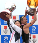 トライアスロンのNTTジャパンカップ最終戦を兼ねた「第14回日本トライアスロン選手権東京港大会」が10月26日、東京都港区台場の特設会場(スイム1.5キロ、バイク40キロ、ラン10キロ=計51.5キロ)で行われ、女子は北京五輪5位の井出樹里(トーシンパートナーズ・チームケンズ)が1時間59分1秒で初優勝、男子は最終種目のランで逆転した田山寛豪(チームテイケイ)が1時間48分46秒で3年連続5度目の優勝を果たした。(写真:表彰式で優勝カップを掲げる井出(左)と田山)