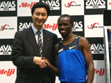 28日、都内で北京オリンピック男子マラソン金メダリスト、サムエル・ワンジル(Team SAM)と明治製菓ザバスとの所属契約発表会見が行われた。多くの取材陣が詰めかけた会場でワンジルは「ザバスを飲んで、世界記録を目指したい。応援よろしくお願いします」と流暢な日本語で挨拶し、さらなる飛躍を誓った。