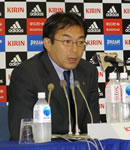 17日、日本サッカー協会(JFA)は22日に行われる北京五輪最終予選初戦ベトナム戦に臨む日本代表メンバー19人を発表した。FW平山(F東京)、MF水野(千葉)ら北京五輪2次予選を戦ったメンバーが選ばれた他、U-20世代からMF柏木(広島)、DF安田(G大阪)らが選出された。反町体制発足時からの中心選手であるFWカレン(磐田)は外れた。(写真:記者の質問に答える反町監督)