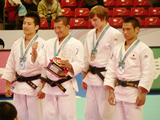 66キロ級の王者は32歳のベテラン江種辰明だ。江種は秋元とは対照的に、初戦から延長戦にもつれ込む苦戦を強いられる。決勝の相手は韓国のアン・ジョンファン。江種は先に技ありを取るが、終始責め続けられる苦しい展開となった。そして、残り30秒をきったところで篠原伸一新監督から大きなゲキが飛ぶ。「下がるな、前に出てさばけ」。その言葉に反応したのか、江種は捨て身突っ込んできた相手をうまく体に乗せた。払腰で一本勝ち。劇的な幕切れに東京体育館に詰めかけた観客は大いに沸いた。(写真:66キロ級のメダリスト。左からアン、江種、コバルスキ、海老沼)