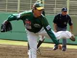 四国・九州アイランドリーグの選抜チームが25日、NPBイースタンリーグの混成チーム(フューチャーズ)と市営浦和球場で交流試合を行った。リーグ選抜は3回、相手のエラーと梶田宙(高知)のタイムリーで2点を先制。しかし、5回に3番手の入野貴大(愛媛)が3四死球の乱調で、同点に追いつかれる。前日に続く連敗は避けたいリーグ選抜は、直後の6回、代打・末次峰明(愛媛)のタイムリーで勝ち越し。7回には2死満塁から3連打で5点を加えて試合を決めると、リーグ選抜の投手陣が6回以降は走者を背負いながら要所を締め、8−2で勝利した。(写真:5回無死満塁のピンチでリリーフし、同点止まりでしのいだ西村拓(香川))