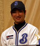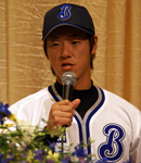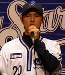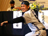 下位指名ながら独立リーグから指名された2選手も壇上で輝いていた。7位指名を受けた大原淳也(四国・九州アイランドリーグ・香川)は、背番号51を球団から与えられた。ハマの背番号51といえば、かつては2年連続首位打者の鈴木尚典がつけていた。「期待されている証だと思う。全力プレーでガムシャラにやりたい」と決意を述べた。香川の先輩である福田岳洋からは、「分からないことがあったら何でも聞いてくれ。一緒に頑張ろう」と電話が入ったという。(写真:尾花監督から「足のある1、2番として任せられる」と評価されて入団する大原)