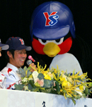 また育成3位の佐藤貴規(仙台育英高)は、今季12勝と飛躍を遂げた由規の弟。兄とは違い、外野手としてプロで勝負する。50メートル5秒7の俊足で、遠投が98メートルと肩も強い。「兄と同じチームに入れると思っていなかった。ビックリです」。背番号は兄(11番)に「1」を加えた「111」に決まった。(写真:マスコットのつば九郎にちょっかいを出され、苦笑いの佐藤貴)