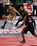 はじめに主導権を握ったのは大阪だった。G高田紘久が自らドライブで切り込んで先制となるシュートを決めると、Cウェイン・マーシャルが続き、連続得点を奪った。対する沖縄は得意の速いパス回しでシュートチャンスをつくるも、ことごとくリングに嫌われ、約2分間は得点を奪うことができなかった。しかし、2分を過ぎると、シュートが決まり出す。4−6と2点差に迫ると、Fカルロス・ディクソンが相手ファウルで得たフリースローを確実に2本決めて同点とする。さらにG小菅直人、Fデイビッド・パルマーが連続得点を奪って、逆転に成功した。その後、堅実なゾーンディフェンスで大阪の攻撃を抑えた沖縄は、攻撃でもパルマーのシュートが立て続けに決まり、16−11と5点のリードを奪った。