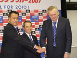 13日、日本サッカー協会(JFA)はJFAハウスで会見を開き、6月上旬のキリン杯にモンテネグロ、コロンビアの両代表を招待することを発表した。同大会は7月のアジア杯に向けた強化試合にあたり、日本を含めた3チームが総当りで対戦する。日本は6月1日に静岡スタジアム・エコパでモンテネグロ代表と、5日に埼玉スタジアムでコロンビア代表と対戦する。(写真:左から田嶋幸三JFA専務理事、三宅占二キリンビール株式会社国内酒類カンパニー社長、イビチャ・オシム日本代表監督)