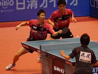 準々決勝では2連覇中の森薗政崇(明治大)&三部航平(青森山田高)組と対戦した。水谷としては、2年連続決勝で敗れている相手。「今年はリベンジ」と燃えていた。ここで3-0(11-9、13-10、11-8)のストレート勝ちを収めた。「あの試合で波に乗れた」と水谷は振り返る。準決勝では大島祐哉&上村慶哉組(早稲田大)の若くて勢いをあるペアを退け、松生&鹿屋組とペア初優勝を賭けて戦った。
