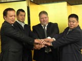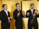 (写真:左からFEGの谷川代表、高田本部長、M-1グローバルのモンテ・コックスCEO、DEEPの佐伯代表)高田統括本部長とがっちりと握手をかわした谷川氏は、「PRIDEが消滅し、格闘技界は混沌としている。素晴らしいコンテンツが分裂し、小さくなっている現状があり、ファンや選手が被害者となっている。今、格闘技界には大連立が必要。(大晦日、大阪で開催する)『Dynamite!!」』とともに、積極的に参加したい。『選手を貸し出す』のではなく、『選手を出す』という気持ちでいる。いろいろな団体が集まって、新しいうねりをつくり、ファンの期待に応えたい」とコメント。