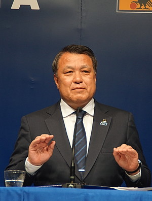 (写真:ハリルホジッチへの感謝の言葉を口にしつつも「勝つために」決断したと語った田嶋会長)