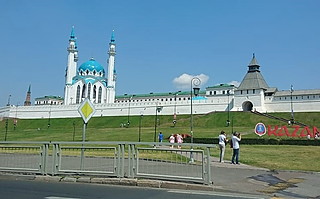 観光の目玉は、ユネスコの世界遺産に登録されているクレムリンです。施設内にあるロシア正教のブラゴヴェシチェンスキー聖堂、イスラム教のクル・シャリーフモスク(写真)が有名です。ロシア文化とイスラム文化、2つの文化が併存する都市の象徴になっています。ちょっと入ってみたかったのですが、明日未明に第3戦の試合会場ヴォルゴグラードに移動しなくてはならないため、残念ながら見送りです。