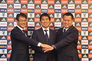 (写真:<右から>田嶋幸三会長、森保一新監督、関塚隆技術委員長)