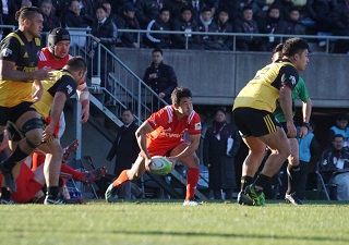 この日の神戸製鋼は攻守ともに隙が感じられなかった。8分にFB山中亮平のトライで突き放すと、14分にはLOトム・フランクリンが中央突破でトライを挙げた。17分にはFLグラント・ハッティングのトライとカーターのゴールで試合をほぼ決めた。27分にカーター、31分には日和佐をベンチ下げた後は、得点が止まった神戸製鋼だったが終了間際に山中のトライで試合を締めくくった。