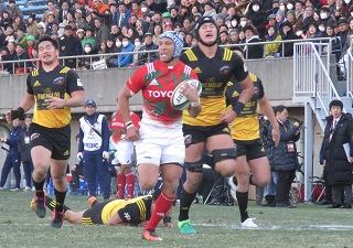 後半に入ると、トヨタ自動車がFWのパワーを生かし、突き放す。3分にジェンキンス、7分にNo.8フェツアニ・ラウタイミ、9分にはFL佐藤穣司のトライ。スワートがキックを2本成功し、この日最大の25点差をつける。