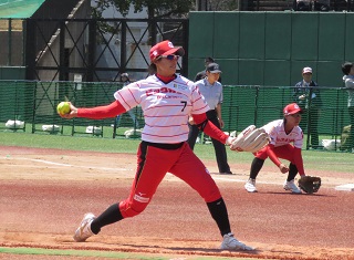 2回裏にはバックが濱村を支える。2死から濱村が8番の古澤春菜、9番の田中麻美に2連打を浴び、 一二塁となった場面だ。1番のアリソン・ アギュラーがライト前ヒットを放つと、 右翼手の糟谷舞乃がバックホーム。悠々タッチアウトで 古澤の生還を許さなかった。