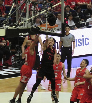 個の力が躍動した千葉に対し、 A東京はチームでバランスよく得点した。 インサイドでカークが幅をきかせ、得意のピック& ロールでPG安藤聖哉、SG田中大貴、 馬場らがリングにアタックする。カークと田中が9得点、 馬場が6得点、安藤が4得点。35― 33とリードして折り返した。