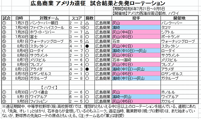 アメリカ遠征で、石本が一番に気を配ったのは、選手らの体調管理であった。中でも、投手起用にはその思想が大きく感じられる。試合結果と、投手の登板回数は下表のとおりである。