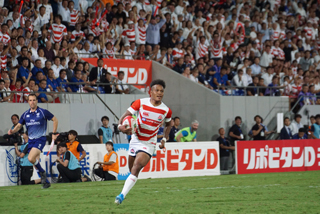(写真:9月のテストマッチで南アフリカからトライを奪った松島。ラインブレイクに期待が集まる)