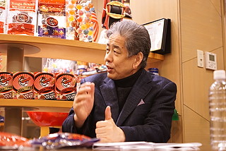 大畑: 正面の棚に激辛デスソースのサドンデスジョロキアが置いてあったので。「へぇ。鈴商さん、これも扱ってるんやぁ」と思ったら、対談用テーブルの上に「激辛」タイプの「テングビーフステーキジャーキー」があるので「あ、なるほど」と(笑)。