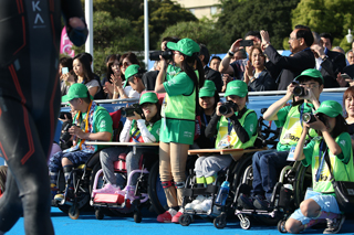越川: おっしゃるように、ひとつにとらわれないことが大事かもしれませんね。例えば、子どもが一般のトライアスロン大会に出場するのは難しくても、キッズボランティアや子ども記者といったかたちで関わることはできます。世界トライアスロンシリーズ横浜大会では、そのイベントにカメラメーカーや新聞社が協力し、子ども記者が大会の模様をそのメーカーのカメラで撮影する(写真)。新聞社では子ども記者が書いた記事や撮影した写真を掲載した特別な新聞を刷っています。関わり方の選択肢はたくさんあっていいと思うんです。