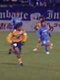 前半18分、センターサークル付近で、MF宮原裕司選手が相手のパスをカット。ボール拾ったFWジョジマール選手が、左サイドのMF赤井秀一選手にパスを送る。そのまま、赤井選手が、敵陣中央に向けて、ドリブルでボールを運ぶ。