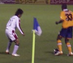 (写真:愛媛がサイドからチャンスメイク) 後半38分、愛媛は相手陣内にて細かくパスをつなぎつつ、攻め上がる。中央でボールをキープしたMF宮原裕司選手が、左サイドでフリーとなっているMF青野大介選手へパス。ボールを受けた青野選手の左足から、ゴール前に向けて絶妙のアーリークロスが供給される。ペナルティエリア内に陣取る江後選手が、このボールを捉え、ジャンピングヘッドでゴールを狙うが、クロスバーのわずか上を越えて、惜しくも得点にはならなかった。後半44分、愛媛のコーナーキックによる攻撃から相手DFのクリアボールが、左サイドでフリーの青野選手に渡った。トラップをはさんで、狙い済まして左足を振りぬくとグラウンダーの鋭い弾丸ミドルが、ゴールマウスに襲いかかる。しかし、相手GKによる必死のセービングで、これもまた得点にはいたらなかった。