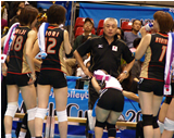 11月2日、「FIVB(国際バレーボール連盟)バレーボールワールドカップ(W杯)2007」が開幕した。日本は開会式後に行なわれた初戦、ドミニカ共和国を相手に3−0のストレート勝ちを収めた。だが、緊張からかプレーに精細さを欠き、第1セットの序盤はミスが目立った。また、今年取り組んできたセンター線はほとんど機能せず、ブロックも荒木絵里香の1本のみ。試合後、柳本晶一監督をはじめ、竹下佳江ら選手たちの顔に笑顔はなかった。(写真:選手に気合いを入れる柳本監督)