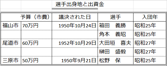 カープは福山市出身の箱田義勝と角本を入団させ、福山市は出資金である70万円をカープ初年度の終わる昭和25年10月24日に議決し、出資した。三原市も同様である。地元の松野を入団させて、9月21日に議決し、出資された。だが、尾道市は出資金が議決されたのは、シーズン3年目の10月で、このときに60万円を出資している。