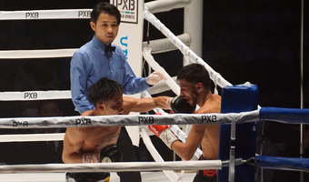 ダウンを奪ったのは8ラウンド。左を当てるとディパエンは大きくフラつき尻餅をついた。仕切り直した後、左フックを見舞う。2人の間にレフェリーが割って入り、試合を止めた。足元はおぼつかなく、挑戦者はレフェリーに支えられながら自らの陣営が待つコーナーに戻った。