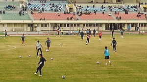 (写真:プレーオフ2回戦、試合前のピッチ内練習)