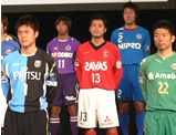 壇上に勢ぞろいした全33クラブの代表選手の中で、珍しい姿を見せたのが、日本代表GK川島永嗣選手(川崎)。いつもと違うフィールドプレーヤーのユニホームで現れたことを訊かれると、「登録はポジションチェンジしていませんでしたかね? 今年は点を取るつもりできました(笑)」と場内を笑わせた。(写真:左から川島、広島・佐藤、浦和・鈴木啓、甲府・秋本、東京V・服部)